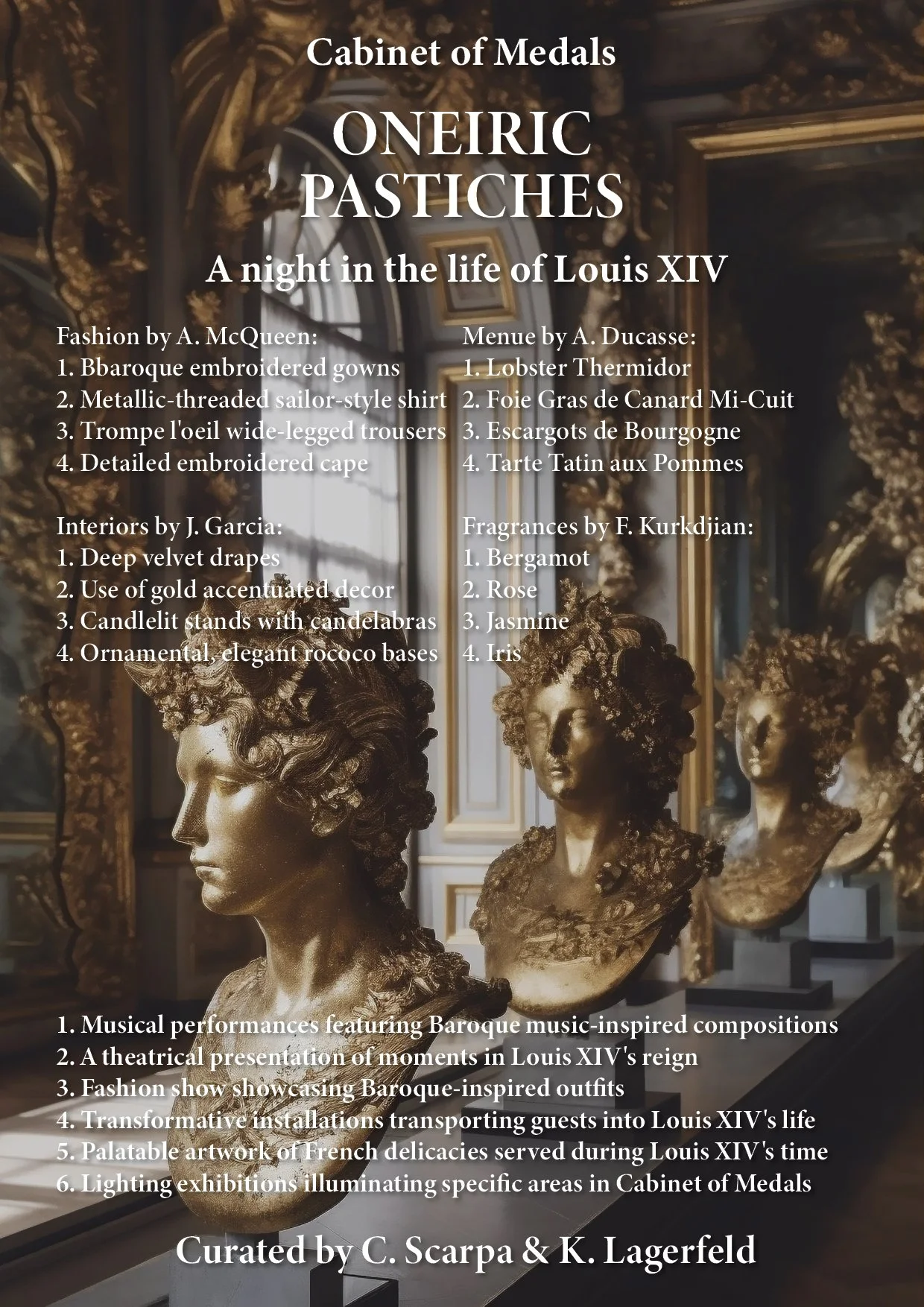 There are fireworks around Lantona Fountain, as Icarus takes flight in an acrobatic performance around it. Buckminster Fuller prepared the Salon of Apollo as a solar eclipse observatory. Julia Morgan addresses cosmical motifs in the Bosquets, proposing a guided meditation session between beds of wild bergamot and trees decorated with wildflower garlands. Gian Lorenzo Bernini reenacts the eruption of Mount Vesuvius in the Salon of Diana, while smoky mezcal margaritas are served in ceramic replicas of Pompeii artifacts. And, very fittingly to the whole occasion, Paul Revere Williams invites Ray Kurzweil to host a conference on AI in the Peace Salon, alongside AI-generated art by Rafik Anadol and music by Holly Herndon. The Palace talks in many colors.